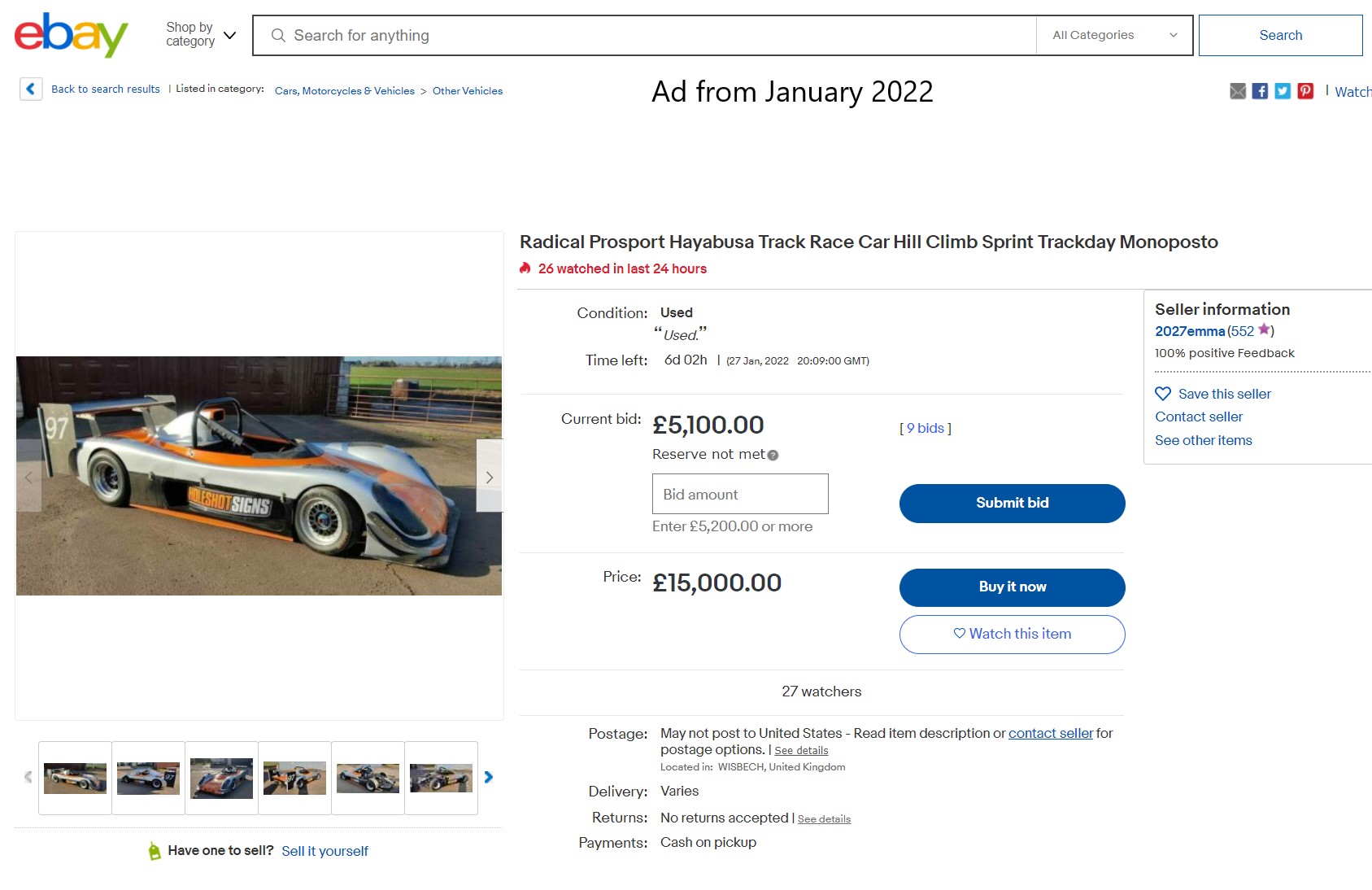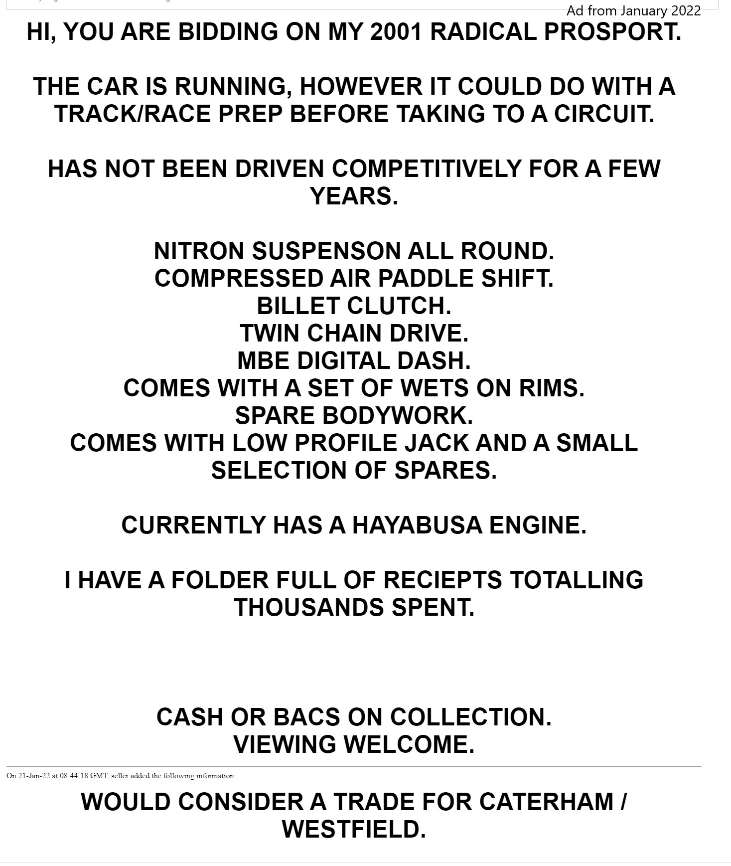 Radical Prosport chassis number RMS 0143 was advertised in January 2022 as having a Hayabusa engine. At that time the car was located in Wisbech U.K.. In May 2025 the car was located in Leamington Spa, UK. It has been painted blue and has a different wing with smaller side plates. It is currently being used for track days