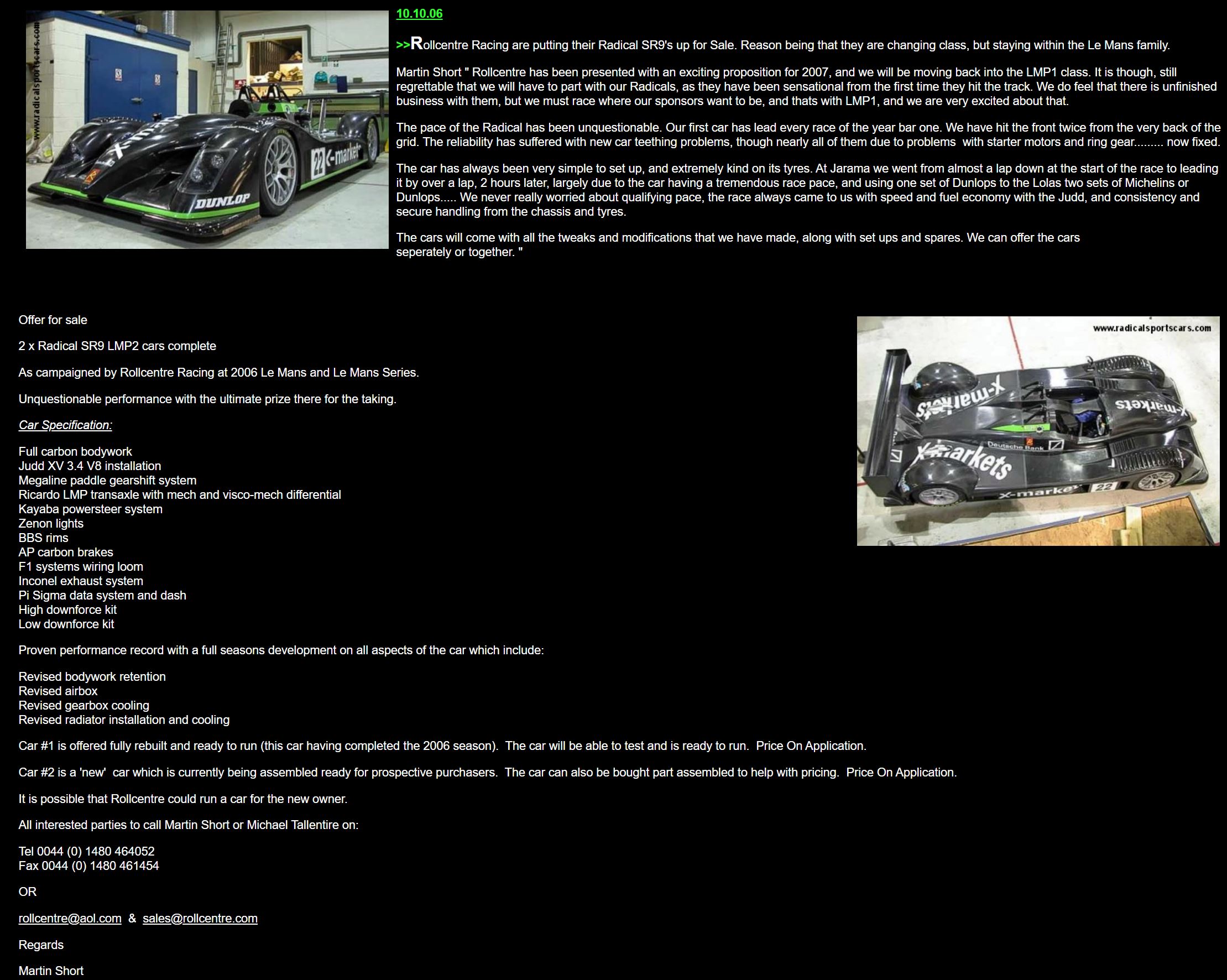 Radical SR9 Chassis number 1 was raced by Rollcentre Racing who was the lead customer for the SR9.  They originally planned to purchase the first two chassis.  The first chassis was to be raced by the Rollcentre factory team and the second chassis was to be raced by a “customer lease driver” that was supported by the Rollcentre Racing team.  Chassis number 1 used a Judd 3.4L naturally aspirated V8 engine that produced 530 bhp and 350 ft. lbs. of torque.   Rollcentre raced chassis number 1 in the 2006 Le Mans series.  The car was completed literally hours before it was loaded on the truck for the first official Le Mans test at Paul Ricard on March 27th, 2006.  The first race was in Istanbul on April 9 and two months later Chassis number 1 was the first SR9 to compete at Le Mans on June 18th, 2006, where it finished 5th in the LMP2 class and 20th overall.  Chassis number 1 was used for FIA testing and was damaged in the testing process but was repaired to be used for the 2006 racing series.  The car was retired after the 2006 racing season and in 2023 the tub of chassis number 1 was located at Greaves Racing in the U.K..