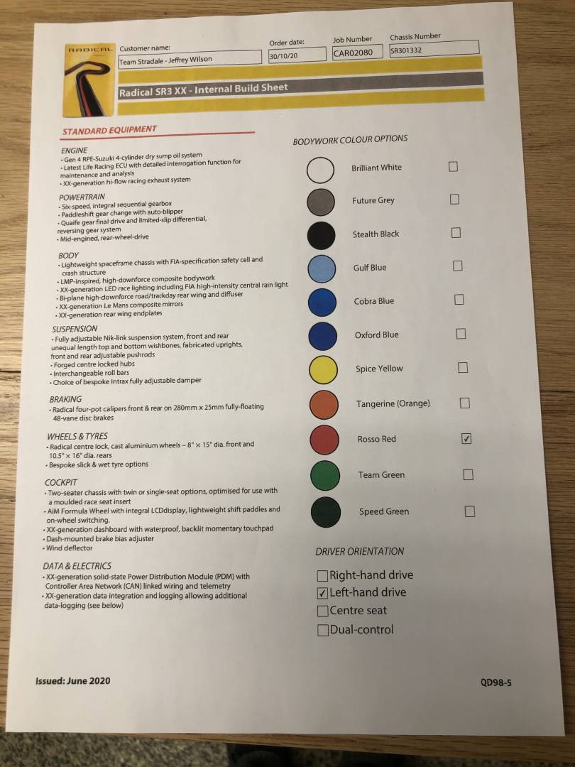 Can you share/send exact build sheet for this car, not general info from Radical website. I have a friend looking for one, but would not want to recommend one without seeing the real build summary and options for this exact car.