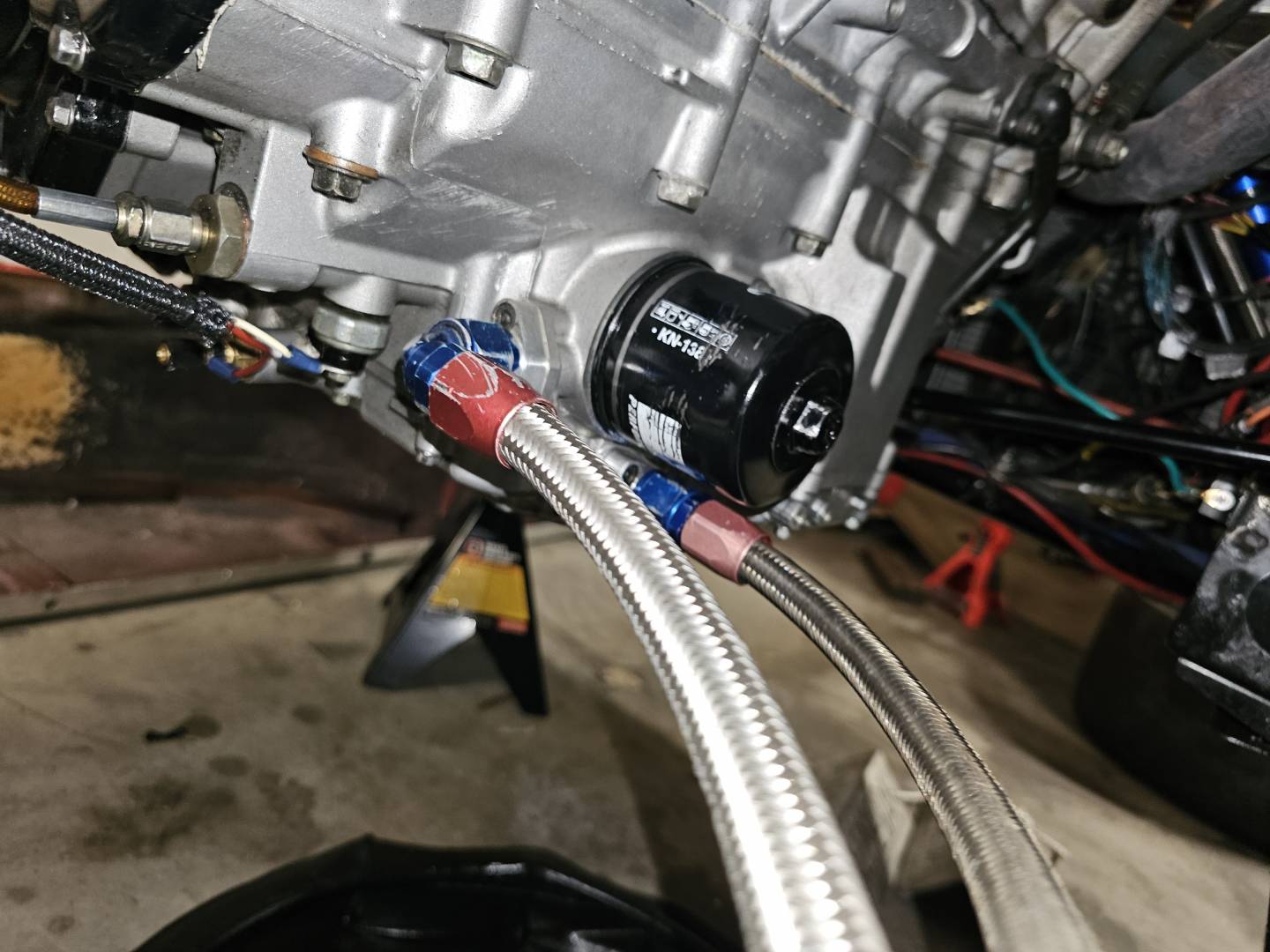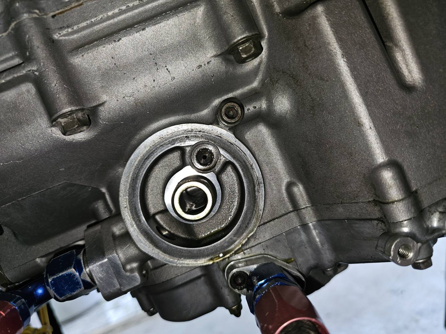 It would also be worth checking that the engine has the grub screw with a hole in behind the oil filter. This is an 8mm Hex headed grub screw that is removed when fitting a dry sump - this jet forces the oil around the oil cooling circuit. If this is removed, as they are on dry sumps, then the oil will not be sent around the cooling circuit. There are three different types of jet, the OEM Suzuki item, a radical one (smaller hole) or a complete blank that was fitted to wet sump SR4's for maximum oil cooling.
