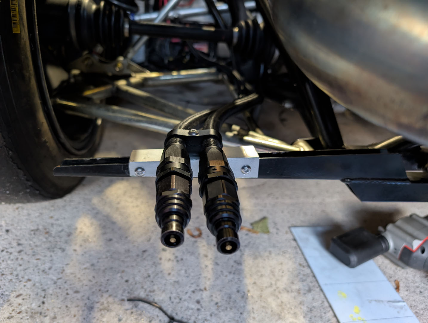 I need to spend another ~£70 on parts, and instead of the dry breaks attaching directly to the coolant lines, have 2 hose lines running from the coolant weldons to the back of the car, running along the floor. I can just tie-wrap it to the chassis/floor/lower suspension arms. I can then plug the heater quickly into the fittings at the back.