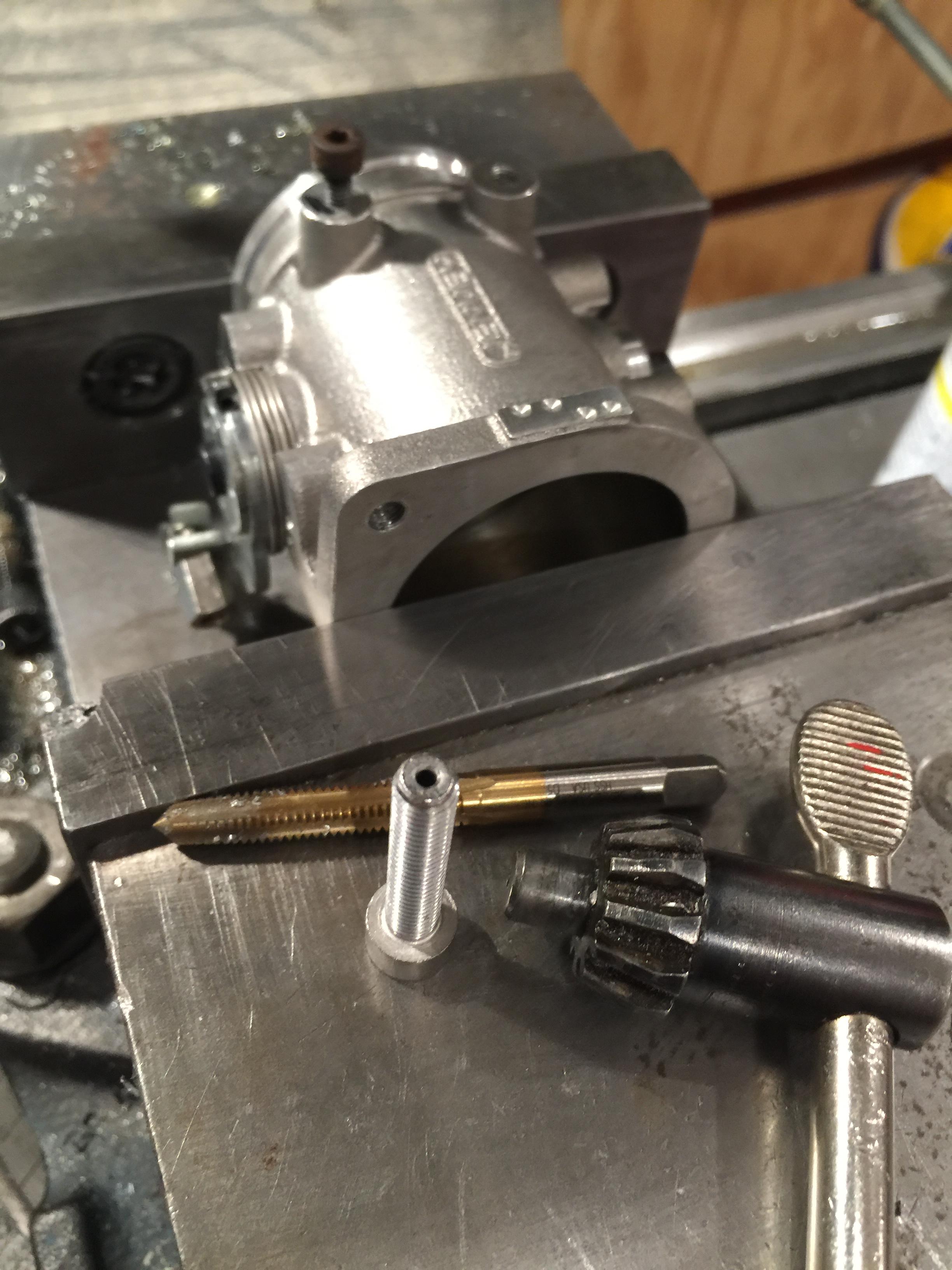 I eventually decided to replace one of the two bolts holding the TB to the alignment rail with a drilled bolt. In order to get a big enough hole, I needed a bigger bolt, so I drilled and tapped each one. You can see the bolt is bigger, and drilled all the way through.