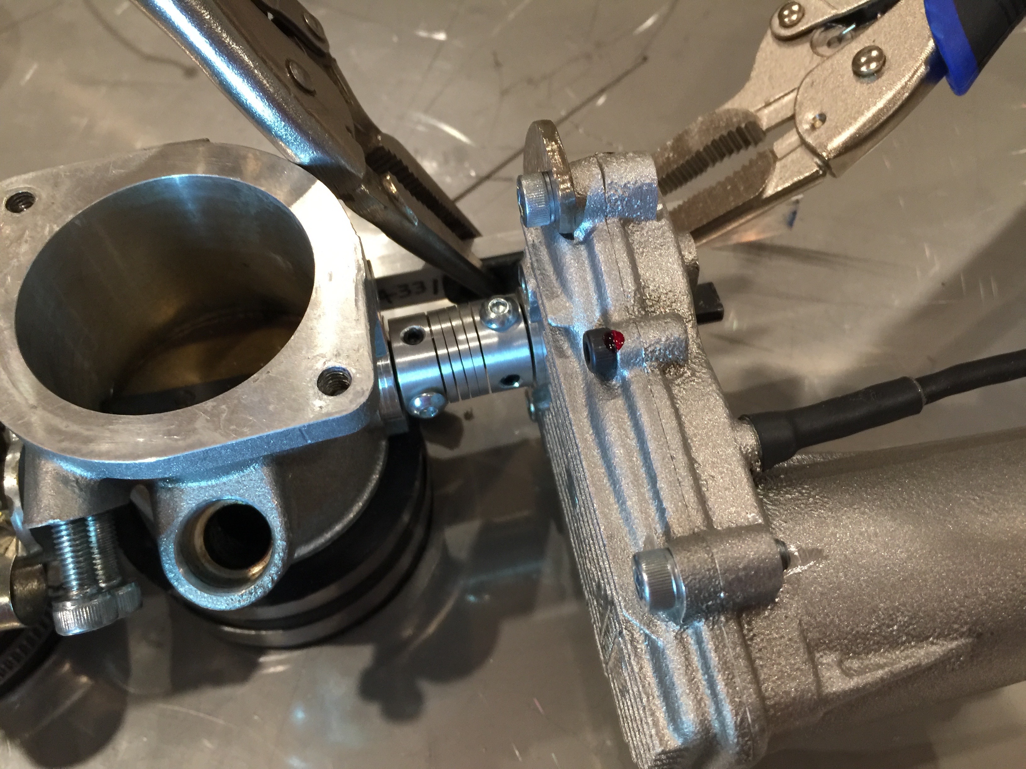 With the vacuum manifold and vacuum port problem solved, I've moved on to how the actuator will work. I found a sweet 8mm ID CNC router coupler that allows the actuator to directly drive the throttle blades. The flats on the actuator and the throttle bodies are exactly 90* apart, allowing full throttle blade. rotation from shut to fully open.