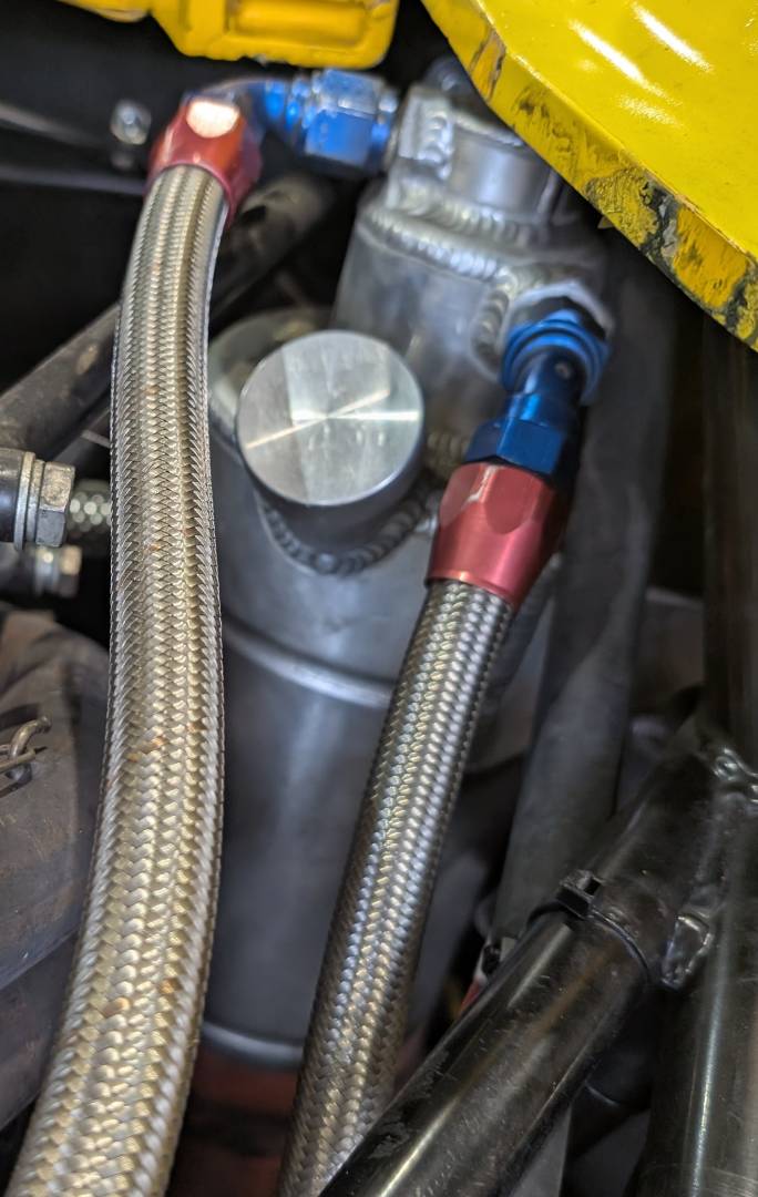 Because of the issue of the oil puking out of the catch can, in an attempt to fix that issue I capped it and then tapped the top of the reservoir and ran a line to the catch can. This greatly reduced the mess however did not fix it.