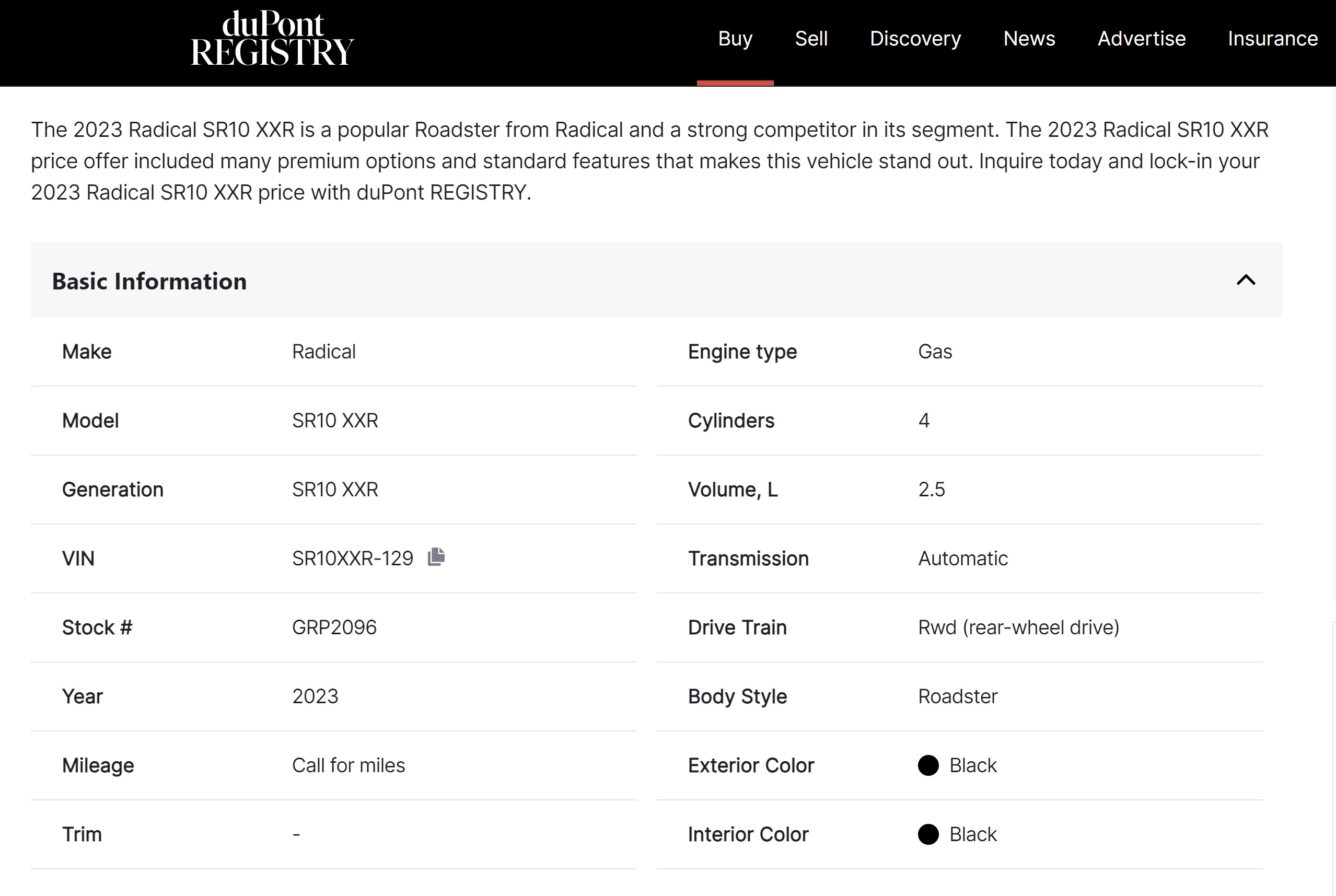 Radical SR10 XXR chassis number 129 is a black car left hand drive car that was originally owned by Rahaul Racing in Indianapolis. In late 2025 the car was purchased by Mark Williams.