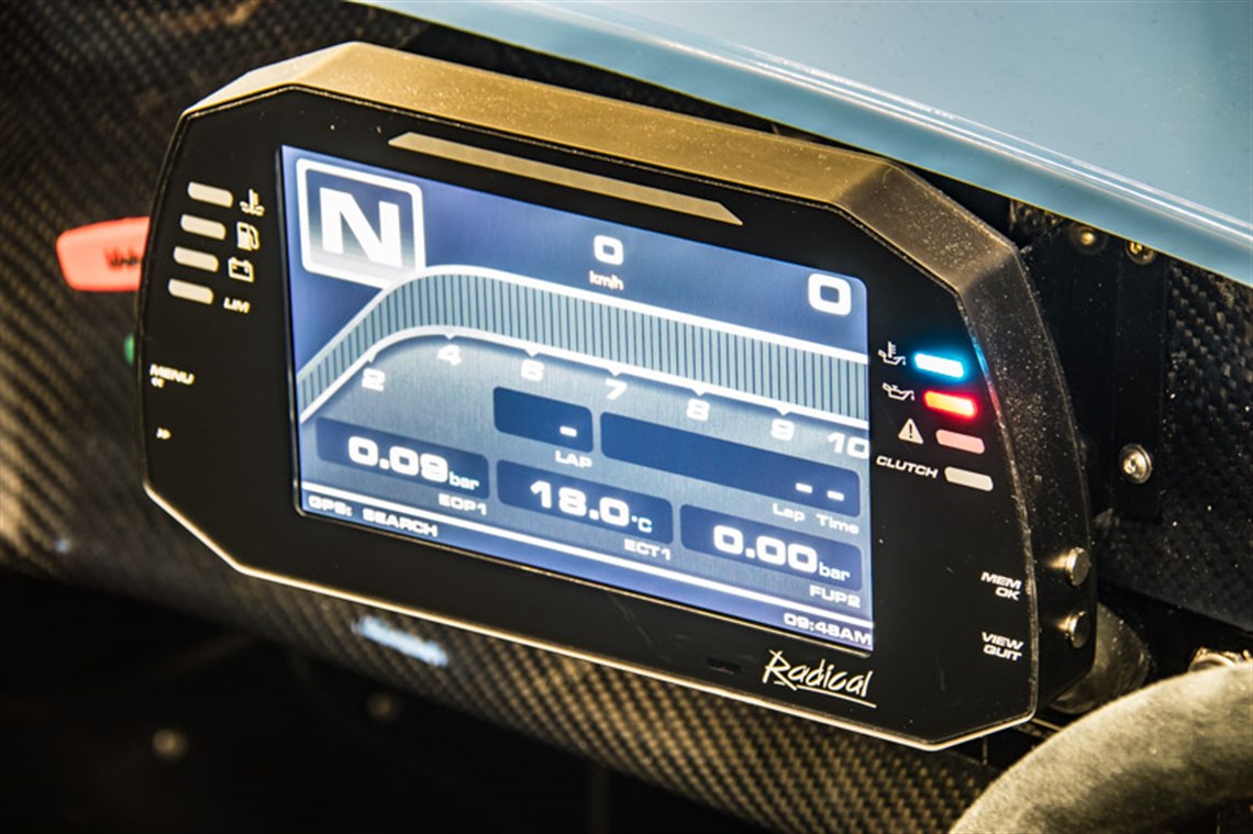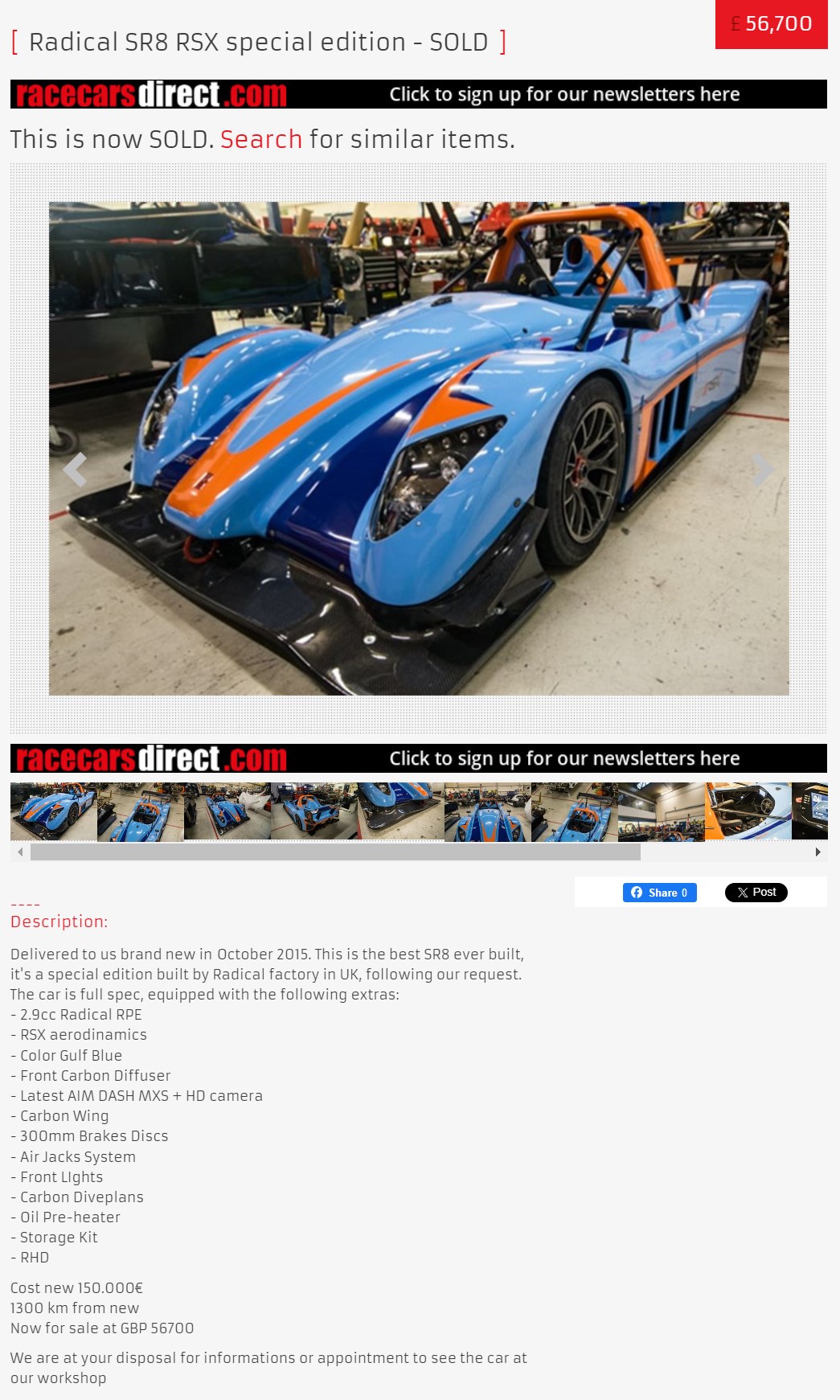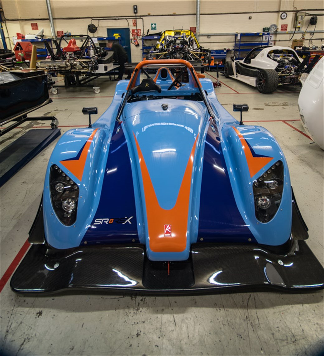 Radical SR8 chassis number 240 is the only SR8 delivered from the factory with an RSX body. It is a Gulf blue right hand drive car with a 2.9L V8 engine, Carbon fiver front splitter, Aim MXS dash, 300mm brakes, and air jacks. In January 2024 the car was located at Radical GP in Italy.